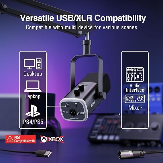 - USB/XLR Connectivity-Versatile PC gaming microphone kit with USB compatibility plug and play for PC in streaming or recording, without additional drivers. And also, while in XLR compatibility for mixer or sound card connection, the XLR studio vocal microphone is good at vocal, podcast, or musical instruments creation.