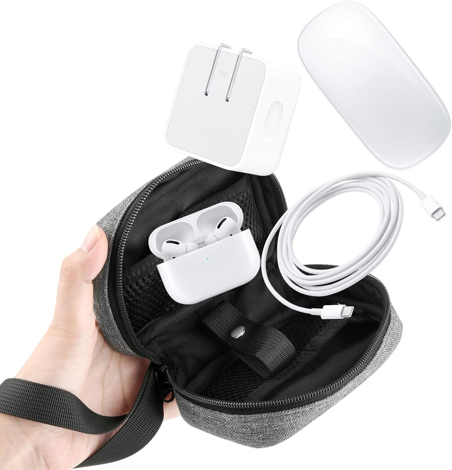 - With 1 strap for cord/cable, 2 mini mesh pocket for earphone box,power adapter. The electronics storage bag has enough space to take in your cord, USB drive, charger, mouse, and other accessories.